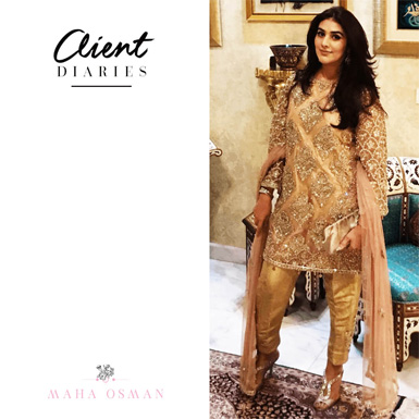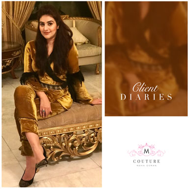 Our beautiful creative director Maha Osman stuns in a chic dull gold velvet suit at a recent party in Lahore.