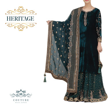 Channel your inner Maharani in this rich velvet gharara set embellished with real emeralds, crystals and traditional dabka!