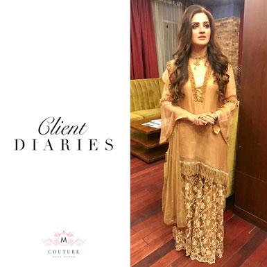 The gorgeous Sundus Jamil looks breathtaking in a dull gold M Couture outfit on the sets of her morning show.