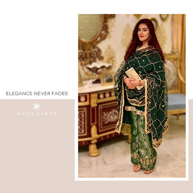 Our favorite super model Maham Amjad looks stunning in a classy emerald green shirt and trouser set from our Luxury Pret Collection paired with our signature gotta dupatta!